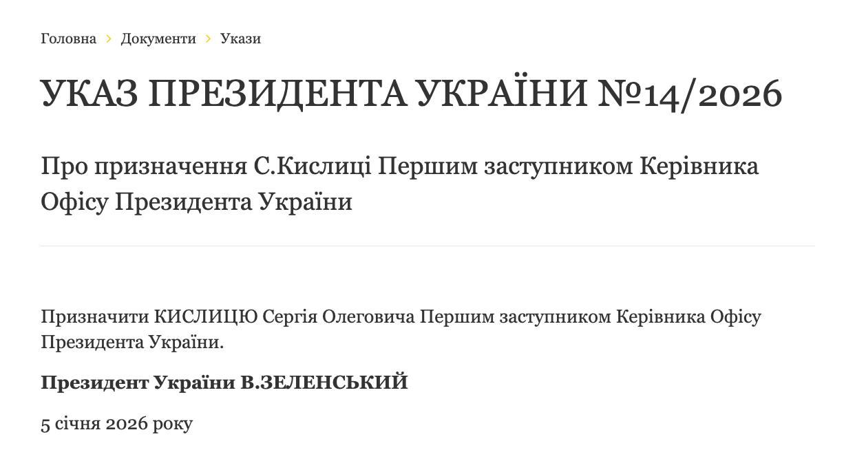 Зеленский назначил Сергея Кислицу первым заместителем главы своего офиса.