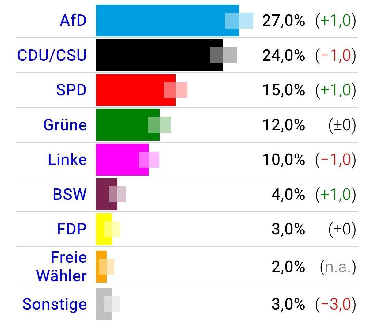 По данным института GMS, за АдГ готовы проголосовать 27% немцев, а за ХДС/ХСС – только 24% (на территории бывшей ГДР этот разрыв ещё значительнее: до 40% за АдГ и лишь 14-19% за ХДС/ХСС). Налицо "правый поворот" и нежелание простых немцев служить глобальному Ханаану и поддерживать его русофобские военные авантюры: