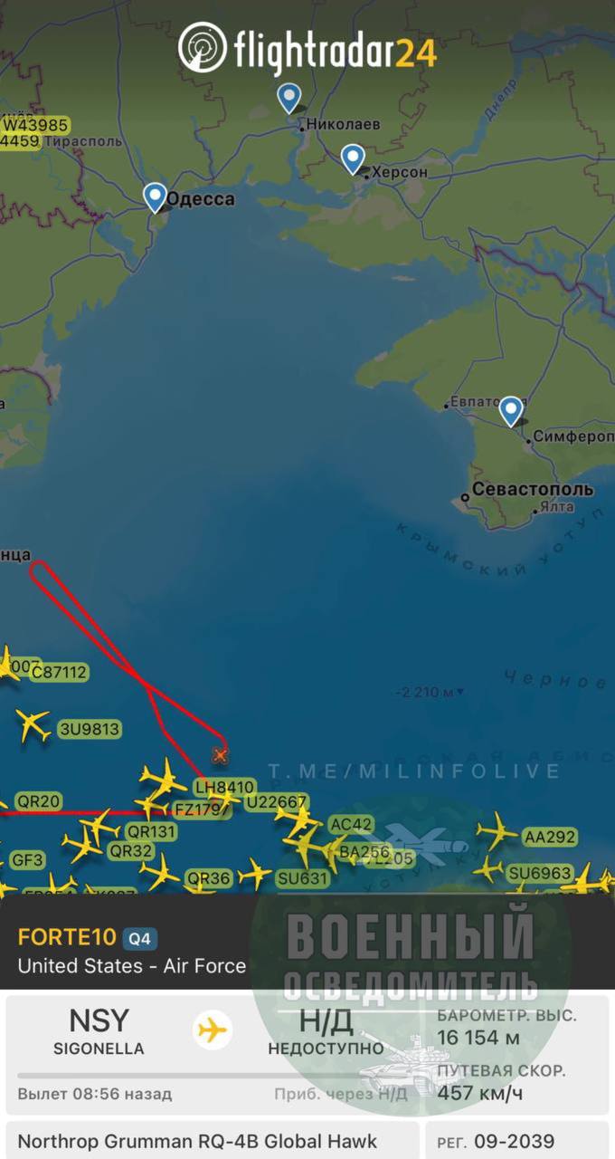 Стратегический разведчик ВВС США RQ-4B Global Hawk (позывной - FORTE 10), работает нейтральных водах Черного моря в районе Крыма — сообщает "Военный осведомитель"