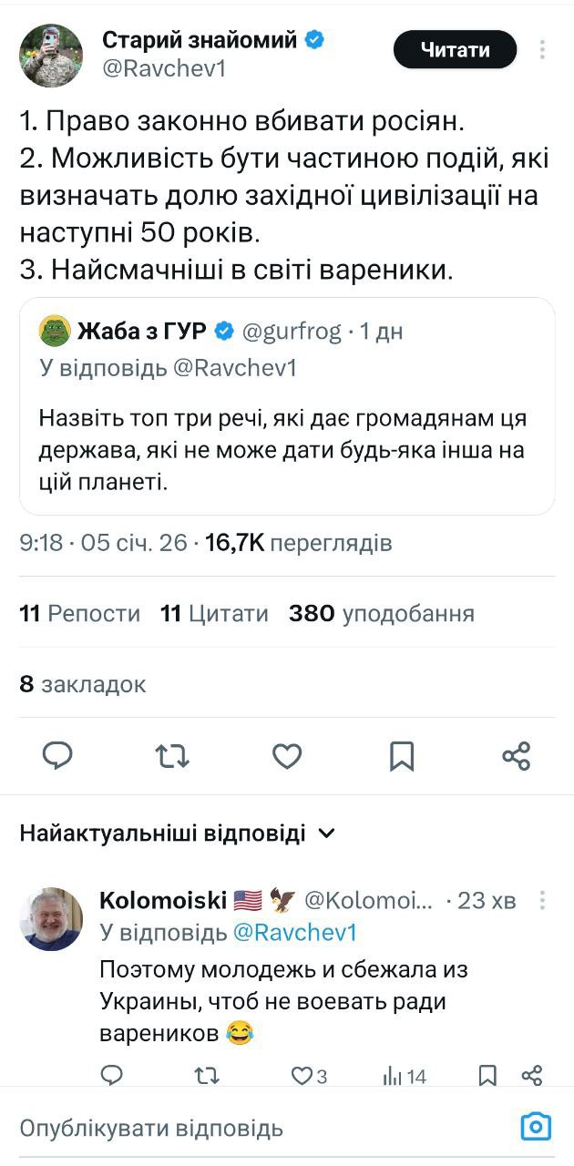 Яркий пример мышления рогуля, которому нужно право убивать людей и умирать ради вареников. Уровень мышления — хутор.