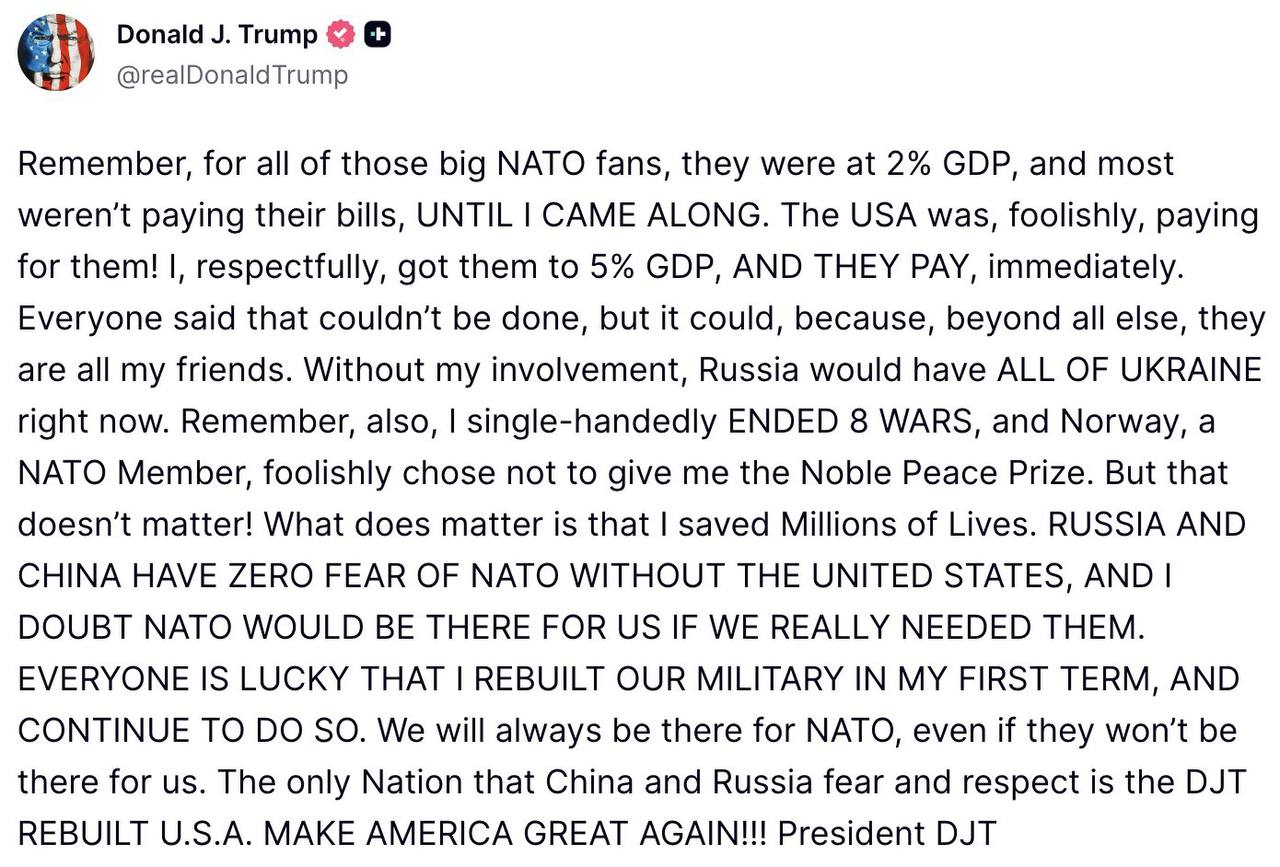 Помните, для всех этих ярых фанатов НАТО, они отдавали 2% ВВП, и большинство из них не платили по счетам, пока не появился я. По глупости, за них платили США! Я, со всем уважением, довел их до 5% ВВП, и они их платят. Все говорили, что это невозможно, но это возможно, потому что, помимо всего прочего, все они мои друзья. Без моего участия Россия сейчас захватила бы всю Украину.