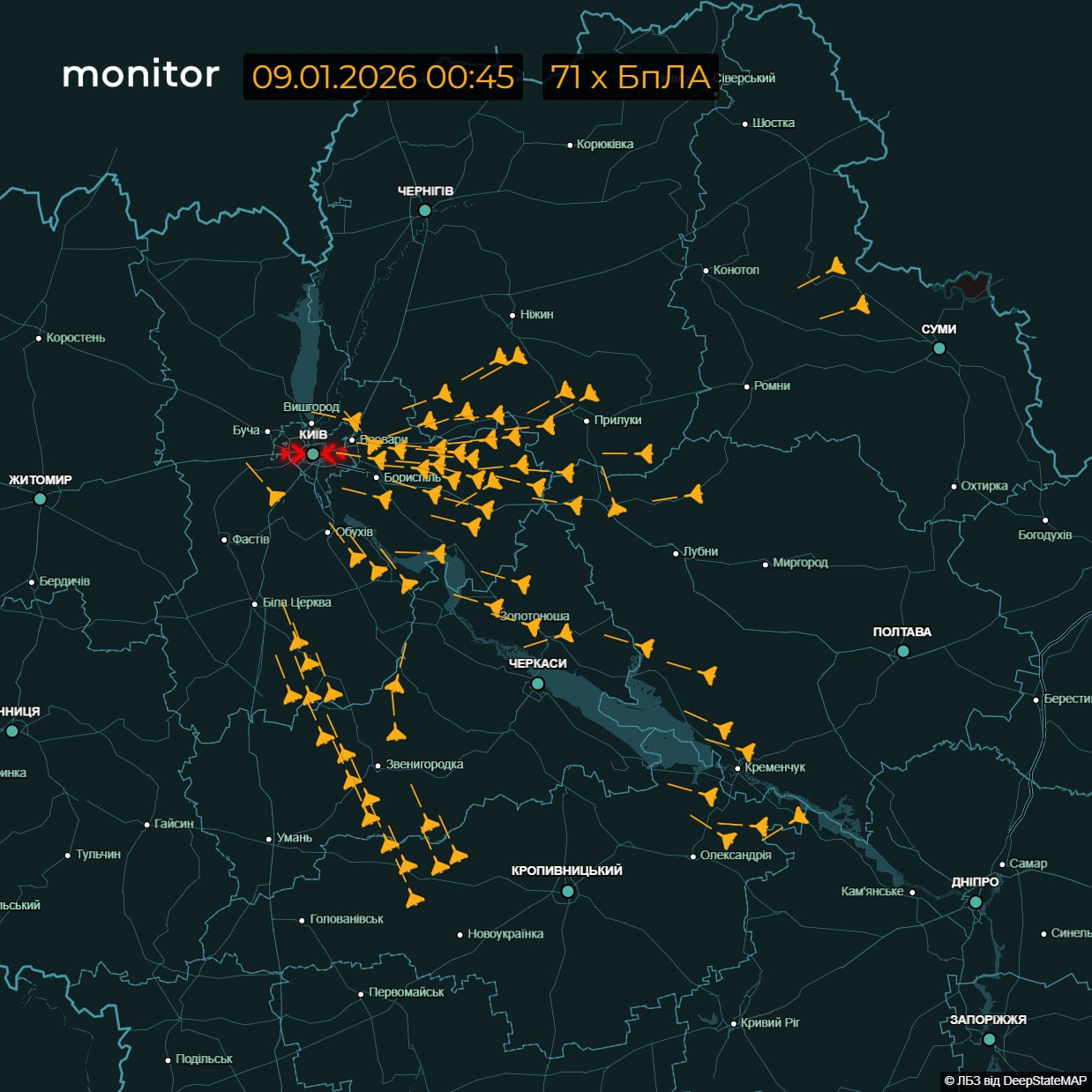 О продолжающейся атаки более 70-ти БПЛА по Киеву пишут украинские мониторинговые ТГ-каналы
