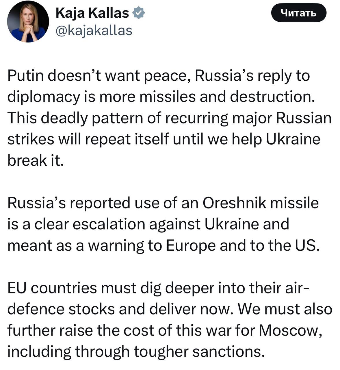 Глава т.н. «европейской дипломатии» Кая Каллас назвала «эскалацией» российское возмездие и призвала поставить все запасы европейских ПВО украинской хунте. Специально для Каллас: ни одно государство в мире не имеет не только аналогов таких сверхмощных гиперзвуковых ракет, но и систем ПВО, способных сбить или перехватить «Орешник». И да, это предупреждение для неонацистского киевского режима, который не оставляет попыток государственного террора. И да, это предупреждение и для «партии войны».