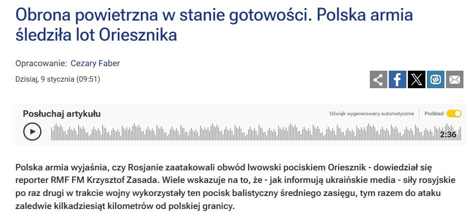«Орешник» ударил по объекту на Западной Украине всего в нескольких десятках километрах от границы с Польшей, — польская радиостанция RMF24.
