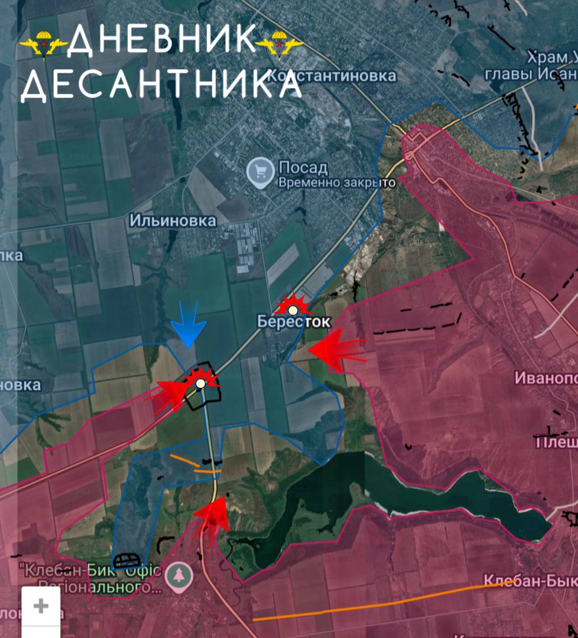 Со стороны Иванополья штурмовые отряды ВС РФ подошли к Берестку, где идёт зачистка вражеских укрытий на окраинах.