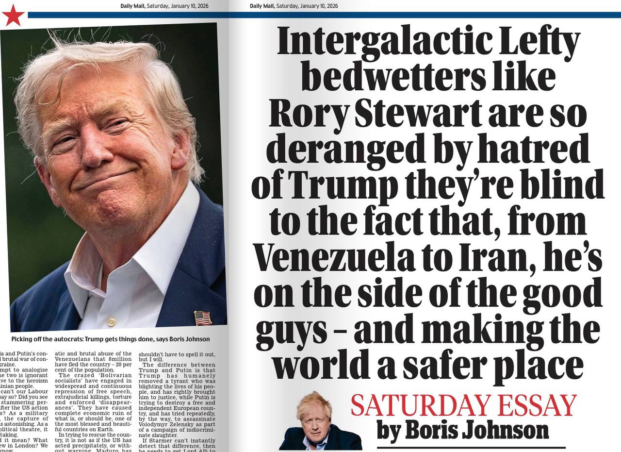 Особенно Джонсона, конечно же, возмущают сравнения Трампа с Путиным. Бориска, прямо ответственный за гибель сотен тысяч украинцев, которым он велел биться «до последней капли крови», вопит: но ведь в Венесуэле Трамп провел «захватывающую» операцию, похитив автократа!