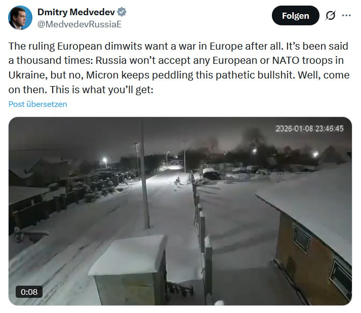 "Правящие европейские тупицы все-таки хотят войны в Европе. Это уже тысячу раз говорилось: Россия не примет никаких европейских или натовских войск на Украине, но нет, Микрон продолжает распространять эту жалкую чушь", — написал зампред Совбеза РФ, сопроводив свое заявление публикацией видео удара ракетой "Орешник".