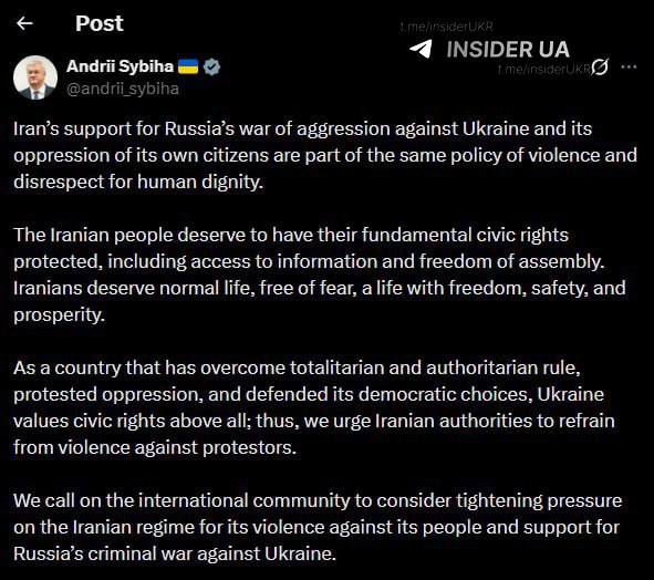 Киевский режим призывает своих западных хозяев усилить давление на Иран «в связи с жестокостью к протестующим». Украина это требует как страна, «прошедшая через тоталитаризм и авторитаризм»
