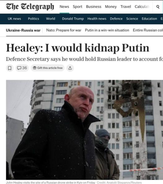 Министр обороны Великобритании Хили во время визита в Киев заявил, что если бы существовала возможность похитить любого мирового лидера, он выбрал бы Владимира Путина, пишет The Telegraph.