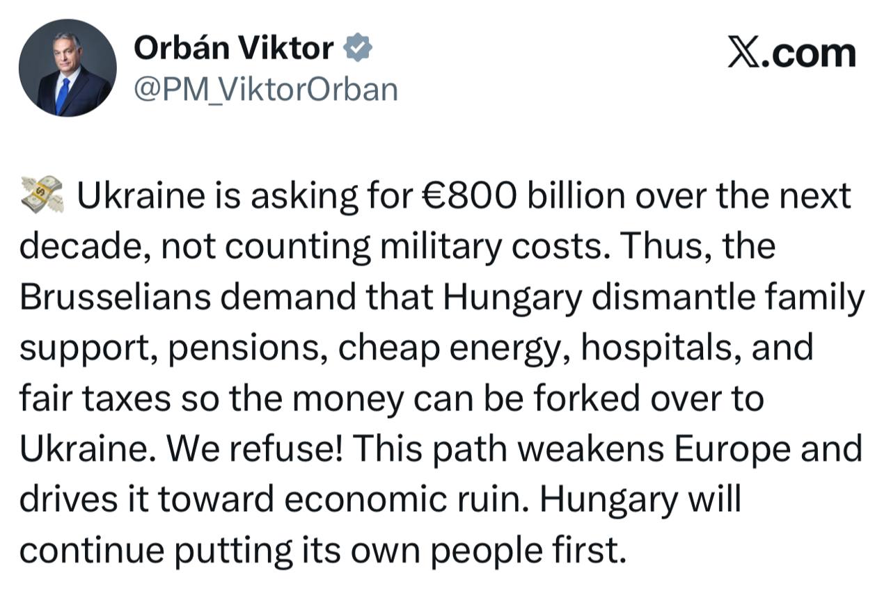 Орбан: Украина требует 800 млрд евро в течение следующего десятилетия, не считая военных расходов. Таким образом, брюссельцы требуют, чтобы Венгрия отменила систему поддержки семей, пенсии, дешевую энергию, больницы и справедливые налоги, чтобы деньги можно было выделить Украине.