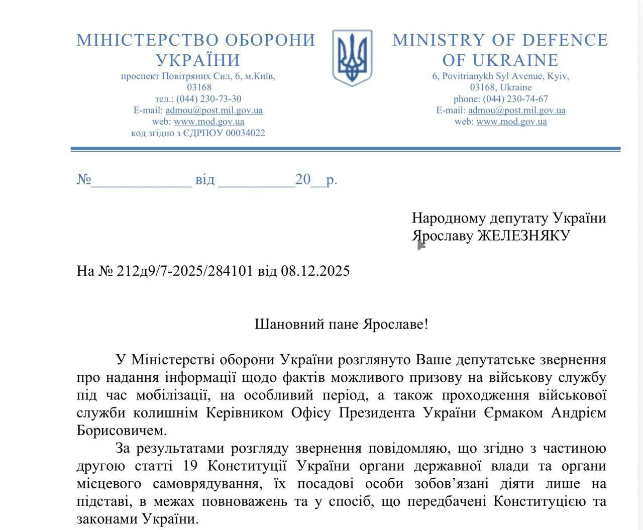 Об этом говорится в официальном ответе министерства обороны Украины на обращение народного депутата Железняка.