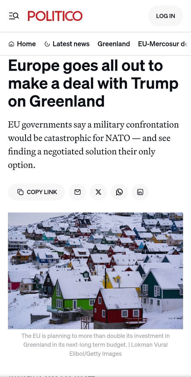 Politico написал 8 января со ссылкой на неназванного высокопоставленного чиновника ЕС: ЕС обсуждает усиление роли США в Гренландии в обмен на гарантии в отношении Украины.