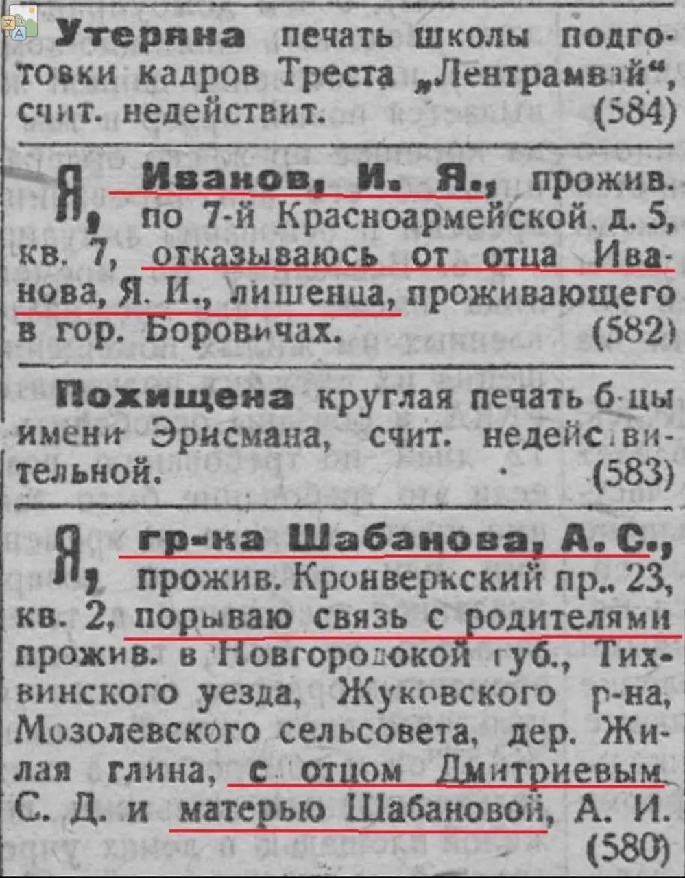 Чаще всего отрекались от родителей. Объявления о таком разрыве появлялись в газетах, как если бы это было обычным делом — рядом с объявлениями о пропавших животных или потерянных вещах. «Порываю связь с отцом, Иваном Власовичем Виноградовым, проживающим по Мал. Обуховской ул. Д. 3 кв 1. Викт. Ив. Виноградов».