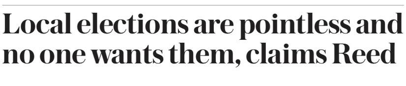 Рид заявил: «Скажите избирателям, что проведение серии выборов в недолговечные советы-зомби будет дорогостоящим и отвлечет ограниченные ресурсы от основных служб, таких как ремонт дорог и социальное обеспечение. Вероятно, они скажут: «Не делайте этого»».