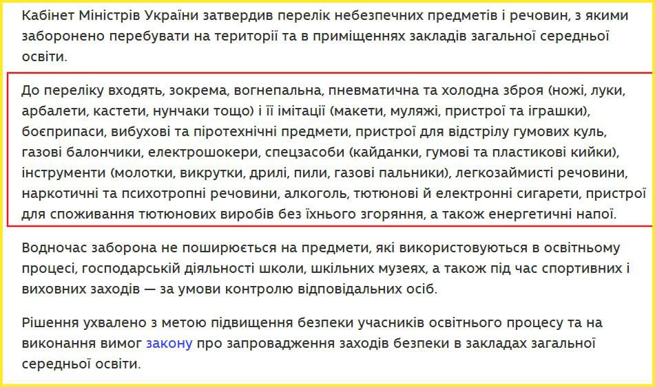"Кабинет Министров Украины утвердил перечень опасных предметов и веществ, с которыми запрещено находиться на территории и в помещениях учреждений общего среднего образования.В перечень входят, в частности, огнестрельное, пневматическое и холодное оружие (ножи, луки, арбалеты, кастеты, нунчаки и т. п.) и их имитации (макеты, муляжи, устройства и игрушки), боеприпасы, взрывчатые и пиротехнические предметы, устройства для стрельбы резиновыми пулями, газовые баллончики, электрошокеры, спецсредства (наручники, резиновые и пластиковые дубинки), инструменты (молотки, отвёртки, дрели, пилы, газовые горелки), легковоспламеняющиеся вещества, наркотические и психотропные вещества, алкоголь, табачные и электронные сигареты, устройства для употребления табачных изделий без их сгорания, а также энергетические напитки.