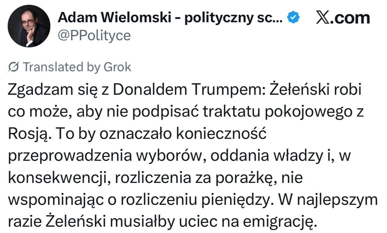 Я согласен с Дональдом Трампом: Зеленский делает всё, чтобы избежать подписания мирного соглашения с Россией. Это означало бы проведение выборов, передачу власти и, следовательно, ответственность за провалы – не говоря уже о необходимости оплачивать счета. В лучшем случае Зеленскому придётся бежать в изгнание.