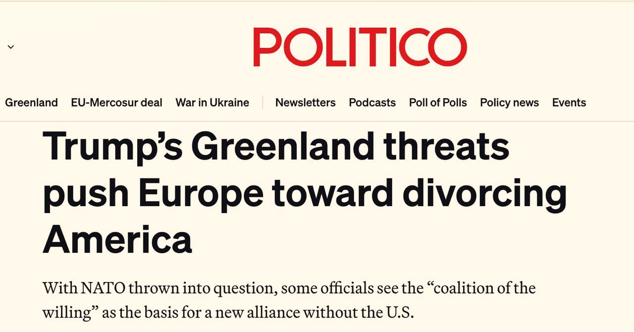 Такое решение зреет из-за угроз Трамп захватить Гренландию. По данным источников издания, многие европейские правительства пришли к выводу, что «теперь развод неизбежен» и призывают к жестким ответным мерам Европы.