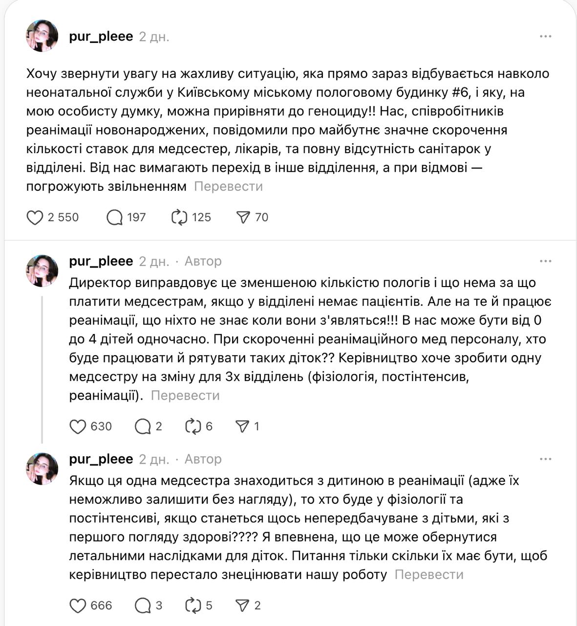 «Руководство хочет сделать одну медсестру в смену для 3х отделений (физиология, постинтенсив, реанимация). Если эта одна медсестра находится с ребенком в реанимации (ведь их невозможно оставить без присмотра), то кто будет в физиологии и постинтенсиве, если произойдет что-то непредсказуемое с детьми, с первого взгляда здоровыми? Я уверена, что это может обернуться летальными последствиями для детей», - пишет Арина Арутюнян.