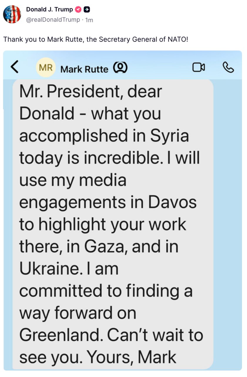 Господин президент, дорогой Дональд — то, чего вы сегодня добились в Сирии, невероятно. Я использую свои медийные выступления в Давосе, чтобы подчеркнуть вашу работу там, в Газе и на Украине. Я нацелен на то, чтобы найти путь вперёд по вопросу Гренландии. С нетерпением жду встречи с вами. С уважением, Марк»