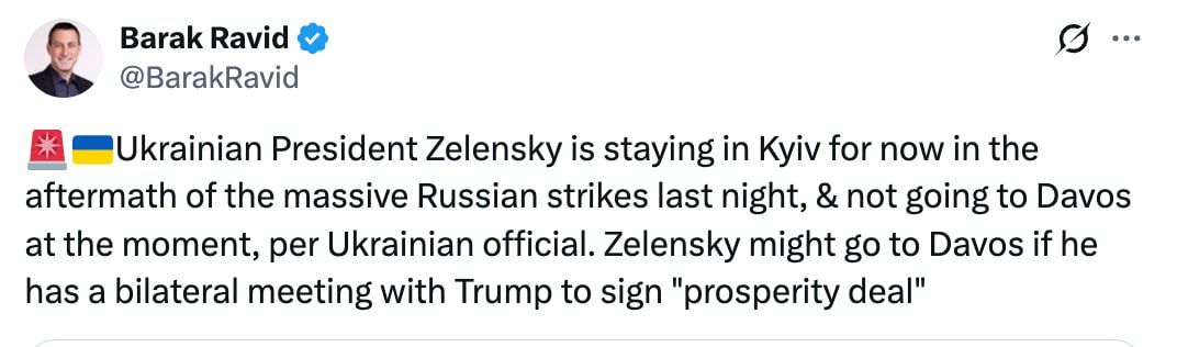 «Президент Украины Зеленский пока остаётся в Киеве после массированных российских ударов минувшей ночью и на данный момент не поедет в Давос, сообщил украинский чиновник. Зеленский может отправиться в Давос, если у него состоится двусторонняя встреча с Дональд Трамп для подписания „соглашения о процветании“».