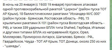Петушиные силы Украины сообщают, что в ходе сегодняшней атаки были применены 18 искандеров и ракет С-300, более трех сотен БПЛА, 11 крылатых ракет Х-101, а также по Виннице прилетел Циркон из Крыма.
