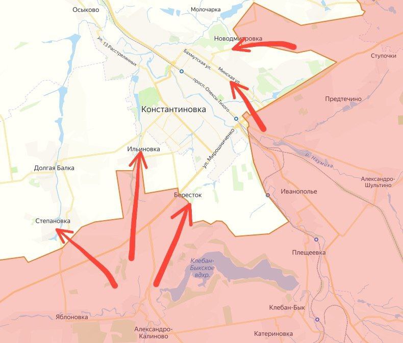 ВС РФ расширяют фронт наступления на левом фланге. Сейчас упор в продвижении идет на два населённых пункта – на Степановку и Ильиновку. Это большие и важные точки на левом фланге Константиновки.
