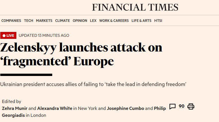 ‘Зеленский начинает атаку на ‘раздробленную’ Европу’ – Financial Times о выступлении в Давосе