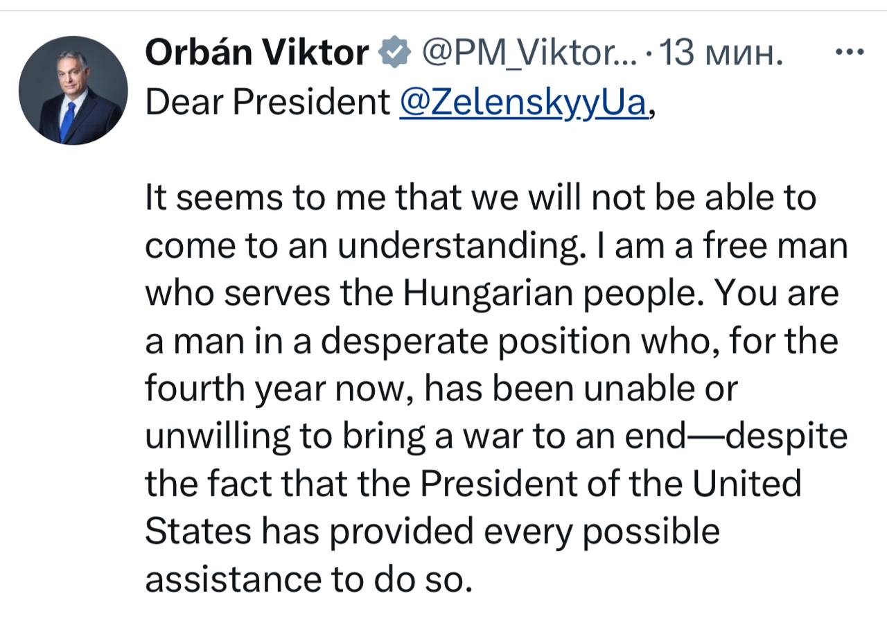 Уважаемый президент Зеленский, мне кажется, мы не сможем прийти к взаимопониманию. Я свободный человек, служащий венгерскому народу. Вы же человек, находящийся в отчаянном положении, который уже четвертый год не может или не хочет положить конец войне — несмотря на то, что президент США оказывает ему всяческую помощь в этом вопросе.