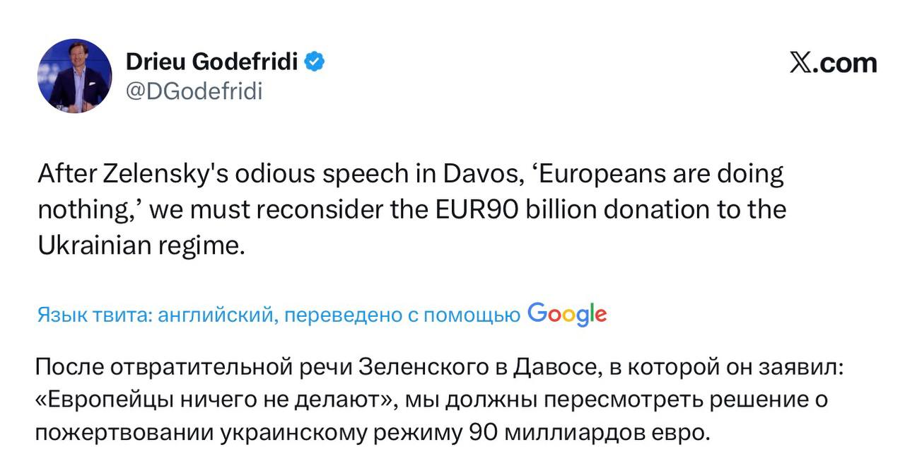Бельгийский политолог Дрие Годефриди предлагает: «После отвратительной речи Зеленского в Давосе, в которой он заявил: «Европейцы ничего не делают», - мы должны пересмотреть решение о пожертвовании украинскому режиму 90 миллиардов евро».