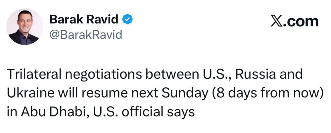 По словам американского чиновника, трехсторонние переговоры между США, Россией и Украиной возобновятся в следующее воскресенье (через 8 дней) в Абу-Даби.