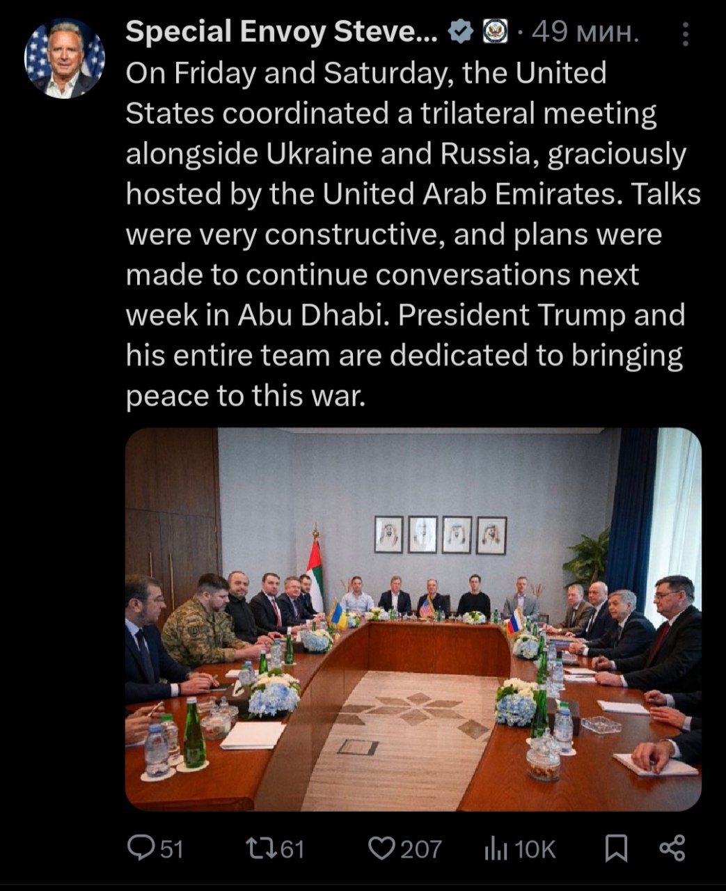 «В пятницу и субботу Соединенные Штаты координировали трехстороннюю встречу с участием Украины и России, гостеприимно организованную Объединенными Арабскими Эмиратами. Переговоры были очень конструктивными, и были составлены планы продолжить обсуждения на следующей неделе в Абу-Даби. Президент Трамп и вся его команда полны решимости добиться мира в этой войне».