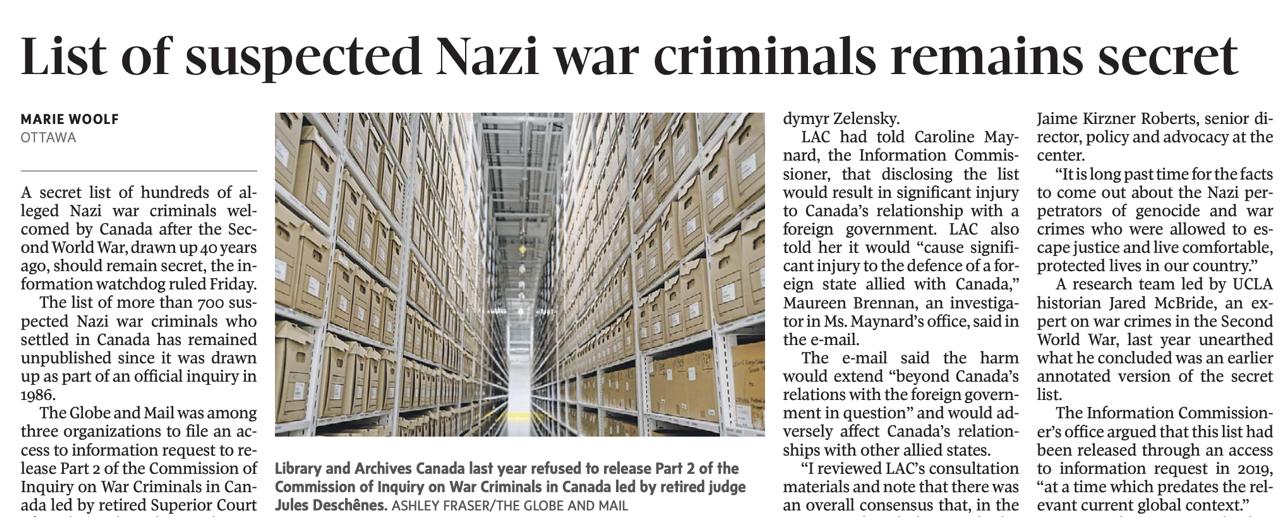Газета The Globe and Mail сообщает, что правительство Канады отказалось обнародовать список сотен украинских нацистских преступников, осевших в этой стране после Второй Мировой войны. Данная газета была среди нескольких организаций, подавших официальный запрос на рассекречивание данных, уже десятилетиями скрываемых от публики.