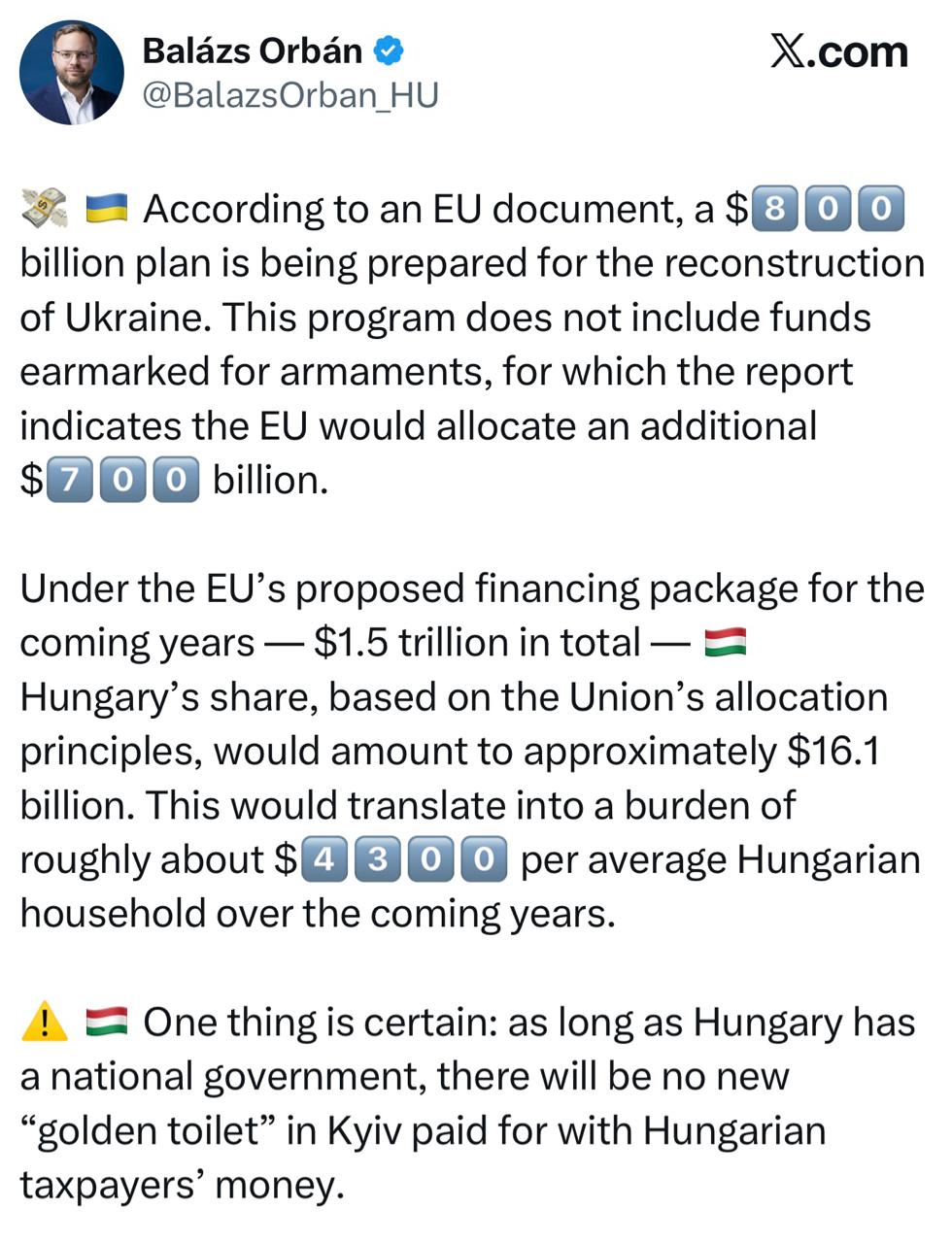 Одно ясно: пока в Венгрии существует национальное правительство, в Киеве не появится новый «золотой унитаз», оплаченный за счёт венгерских налогоплательщиков.