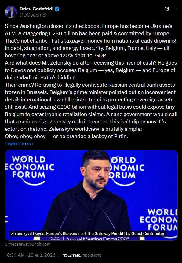 «С тех пор как Вашингтон закрыл свою чековую книжку, Европа превратилась в банкомат Украины. Европа обязалась выплатить колоссальную сумму в 280 миллиардов евро. Это не благотворительность. Это деньги налогоплательщиков стран, которые и без того тонут в долгах, стагнации и энергетической нестабильности. Бельгия, Франция, Италия — все балансируют около или выше 120% долга к ВВП.