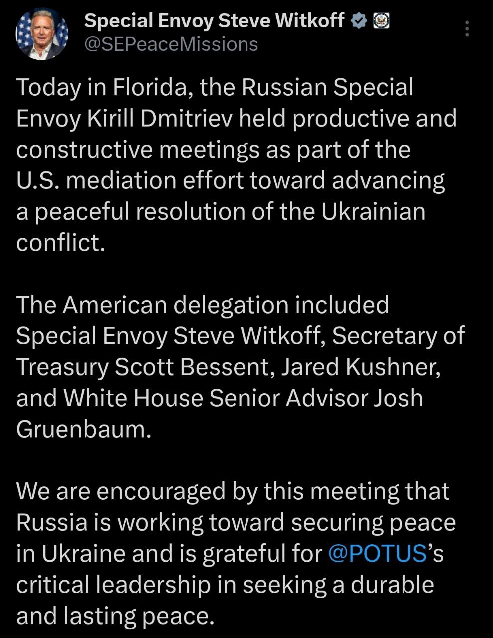 "Мы воодушевлены". Уиткофф заявил, что переговоры с Дмитриевым были "продуктивные и конструктивные".