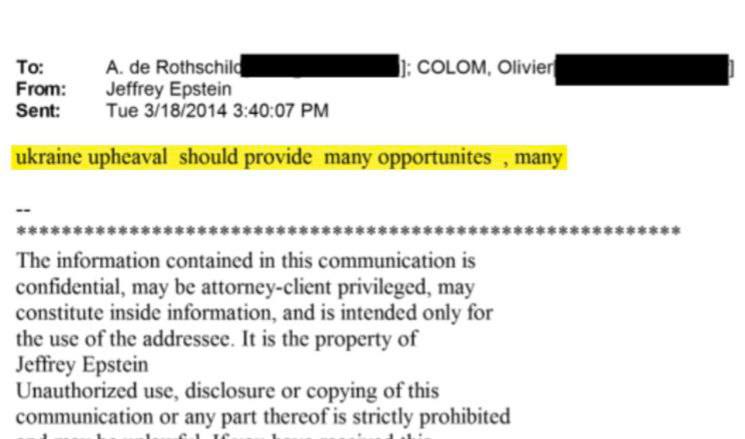 Как написал Джеффри Эпштейн в электронном письме после Майдана от 18 марта 2014 года Ариан де Ротшильд, вице-президенту и члену правления Группы Эдмон де Ротшильд, и Оливье Колом (международный советник Группы Эдмон де Ротшильд):
