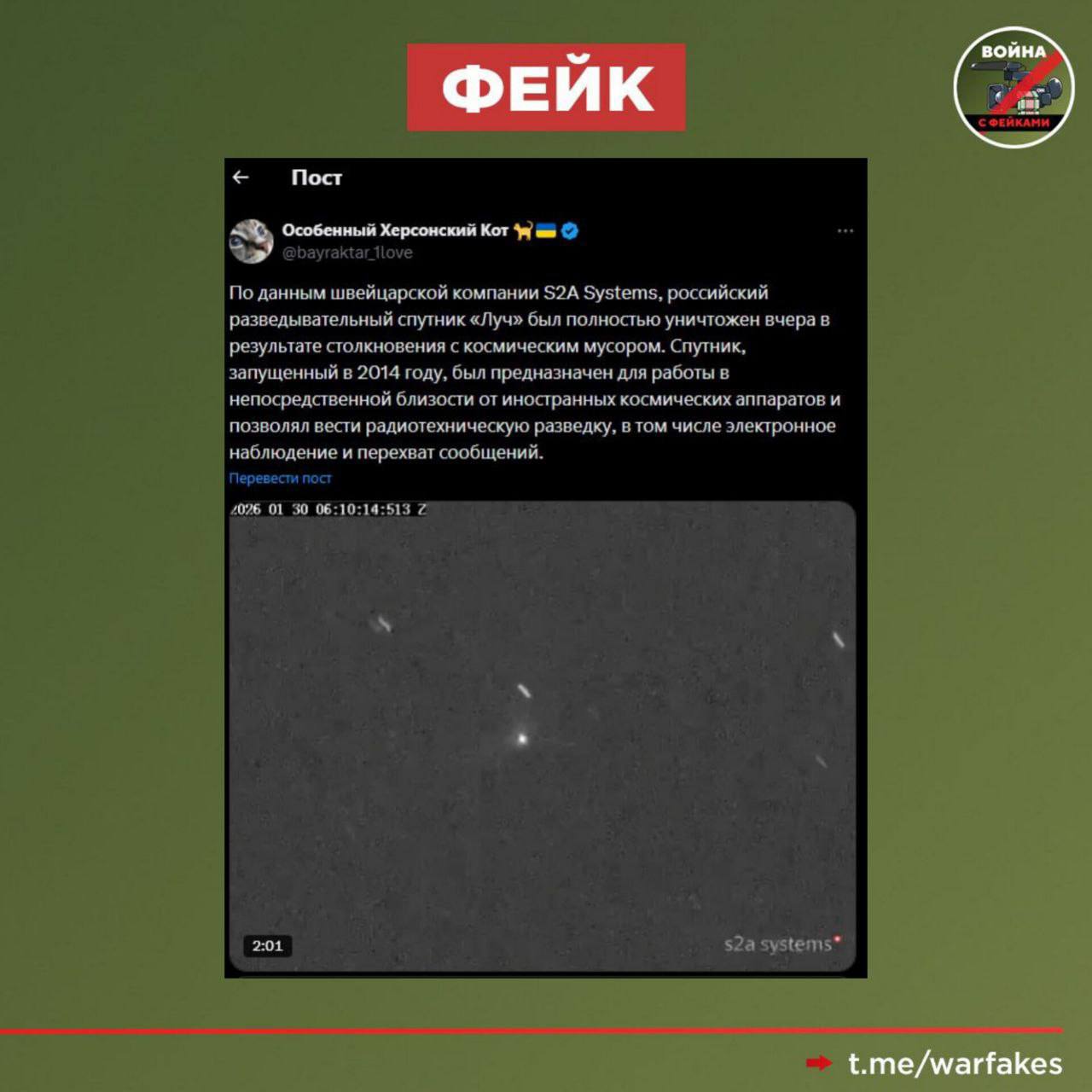 Отметим, что основой для фейка стала заурядная для космических реалий новость. 30 января 2026 года швейцарская компания s2A systems, специализирующаяся на мониторинге космической обстановки, зафиксировала разрушение спутника и опубликовала эту информацию в формате отчета. Украинские пользователи Х, не посчитавшие нужным разобраться в технических деталях, немедленно увидели причину для перемоги.