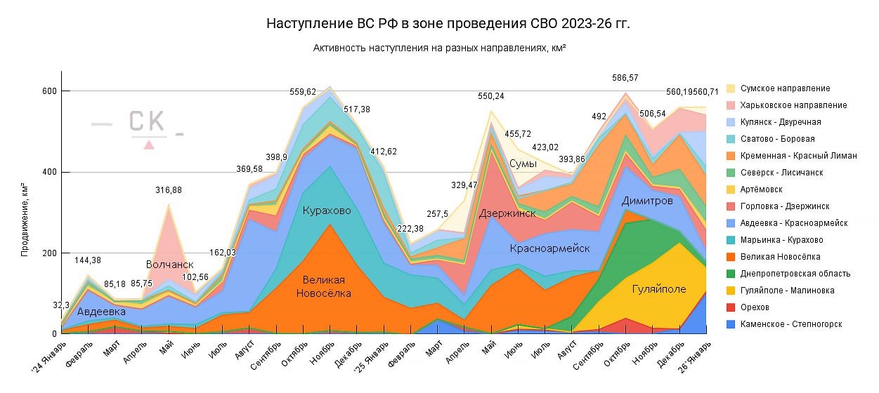Новую инфографику интенсивности наступления ВС РФ в зоне СВО на различных направлениях к февралю 2026 представил канал "Сливочный каприз".