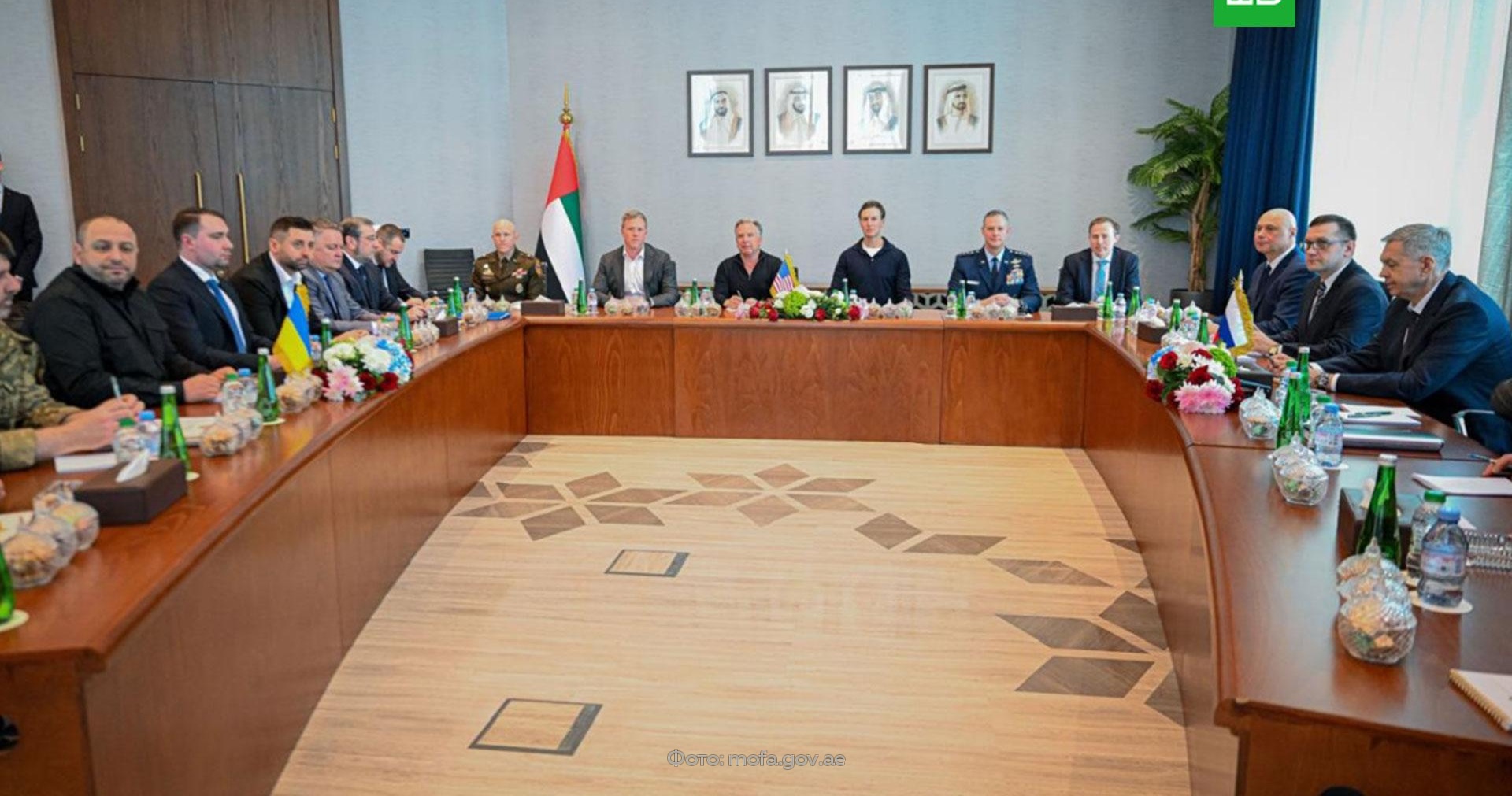 На снимке, размещенном на сайте МИД ОАЭ, делегации России, США и Украины сидят на столом в форме буквы «П».