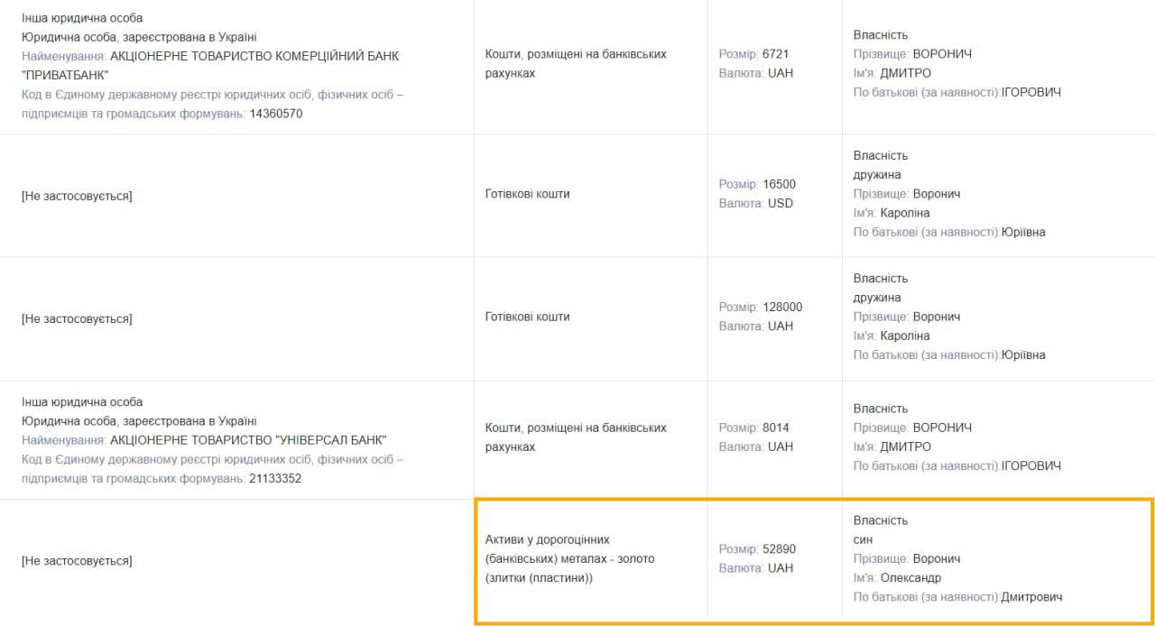 В новой декларации депутата Черновицкого районного совета Дмитрия Вороныча гласит, что его сын Александр Дмитриевич хранит золотые слитки на сумму в 53 тысячи гривен.