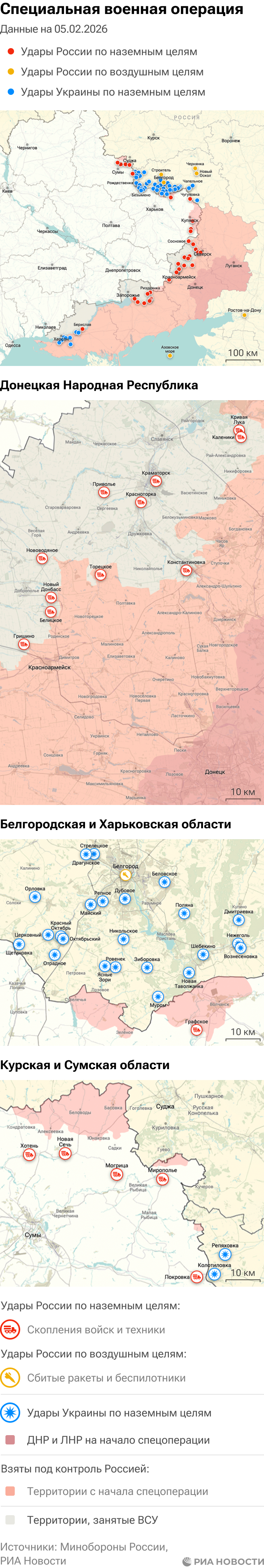 Российская армия с 24 февраля 2022 года проводит на Украине специальную военную операцию. Ее главной целью является помощь Донецкой и Луганской народным республикам, на территории которых с 2014 года не прекращались обстрелы. Перед российскими военными поставлена задача минимизировать потери личного состава и мирного населения при выполнении боевых заданий.Данные Минобороны и администраций новых регионов на 5 февраля 2026 года