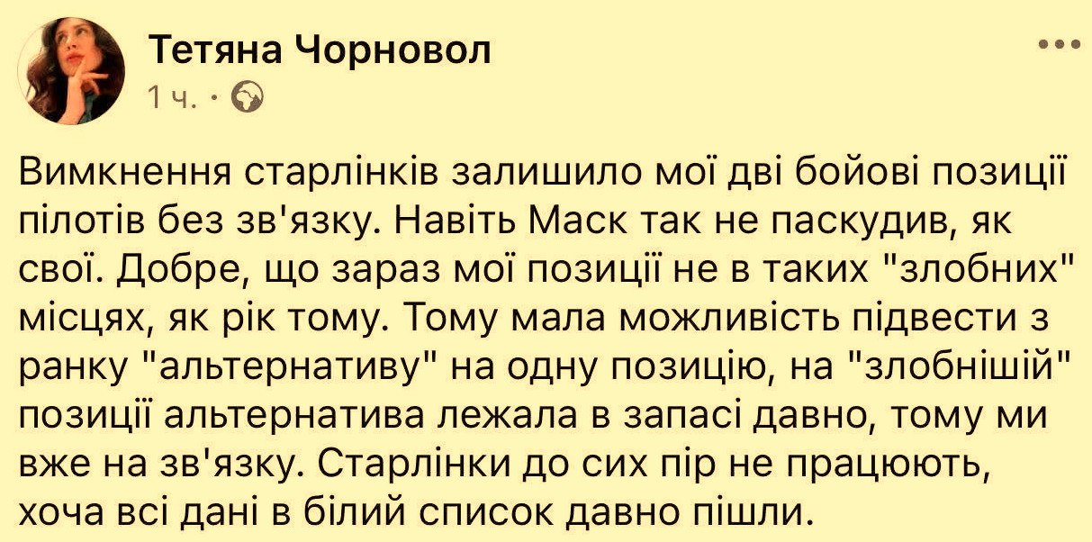 Бандеровка Татьяна Черновол, командующая взводом 72-й бригады ВСУ, пожаловалась, что ее бойцы остались без Starlink после начала отключений незарегистрированных терминалов