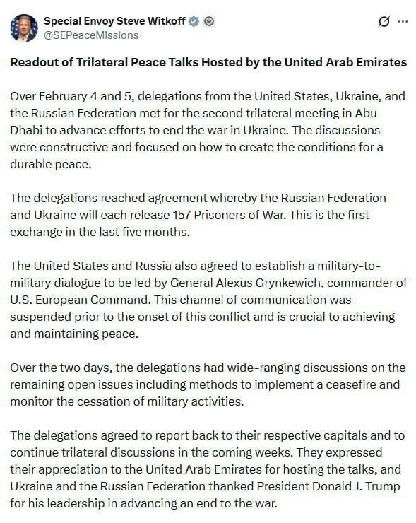 Трехсторонние встречи в Абу-Даби носили конструктивный характер и были сосредоточены на создании условий для прочного мира, заявил Уиткофф. В ходе переговоров делегации США, РФ и Украины обсудили обеспечение прекращения огня и механизм мониторинга.