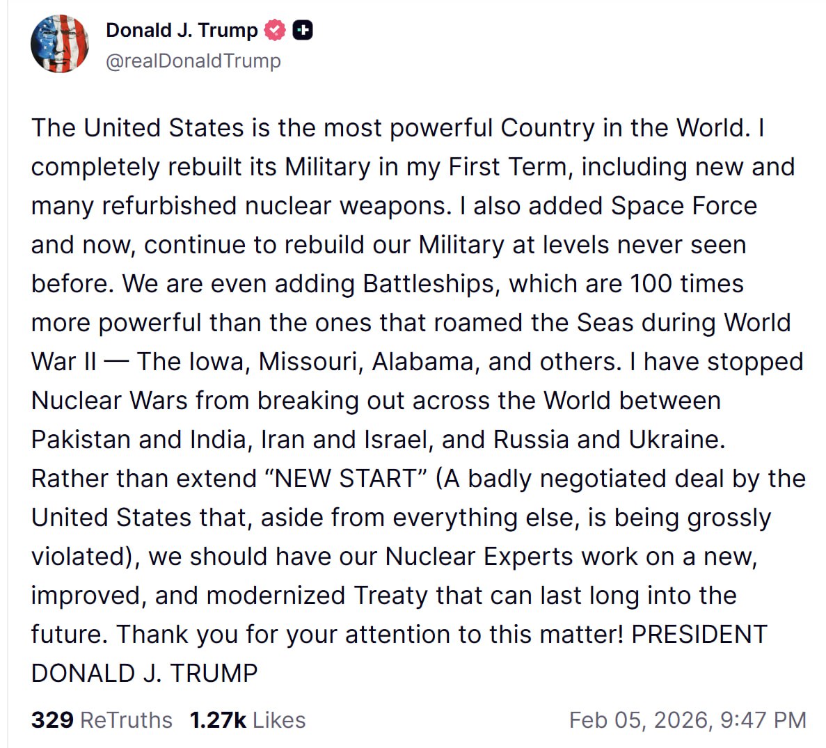 «Соединенные Штаты – самая могущественная страна в мире. В мой первый срок я полностью восстановил их Вооруженные силы, включая новые и множество отремонтированных ядерных вооружений. Я также добавил Космические силы, и теперь мы продолжаем восстанавливать нашу армию до беспрецедентного уровня. Мы даже добавляем линкоры, которые в 100 раз мощнее тех, что бороздили моря во время Второй мировой войны — «Айова», «Миссури», «Алабама» и другие. Я предотвратил ядерные войны, которые могли вспыхнуть по всему миру между Пакистаном и Индией, Ираном и Израилем, а также Россией и Украиной. Вместо продления «New START» (это плохо согласованная США сделка, которую, помимо всего прочего, грубо нарушают), нашим ядерным экспертам следует разработать новый, усовершенствованный и модернизированный Договор, который сможет прослужить долго в будущем. Спасибо за внимание к этому вопросу! ПРЕЗИДЕНТ ДОНАЛЬД ДЖ. ТРАМП».