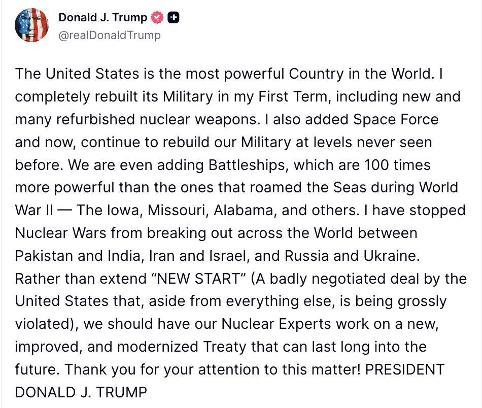 Кроме того, президент США вновь похвастался проектами своих бумажных линкоров и заявил, что вместо почившего ДСНВ необходимо разработать новое соглашение по контролю за ядерными вооружениями.