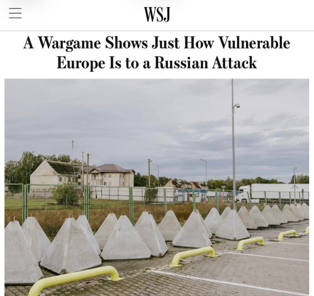 «Недавняя военная игра, проведенная изданием Die Welt и немецкими экспертами, показали, что НАТО может оказаться в опасно медленном и разрозненном положении, если Россия предпримет ограниченное вторжение в Литву, особенно используя тактику «серой зоны», например, гуманитарные предлоги, а не полномасштабное вторжение. Так, оказалось, что Россия может добиться доминирования в странах Балтии всего с 15 000 военнослужащих.
