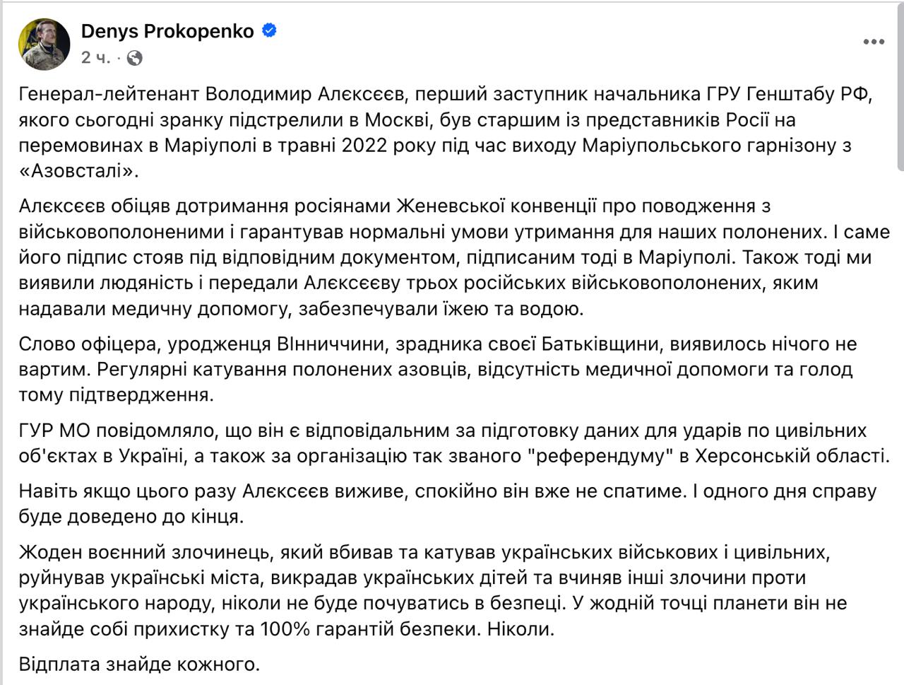 «Даже если на этот раз Алексеев выживет, спокойно он уже не будет спать. И однажды дело будет доведено до конца», - пишет бандеровец Прокопенко.
