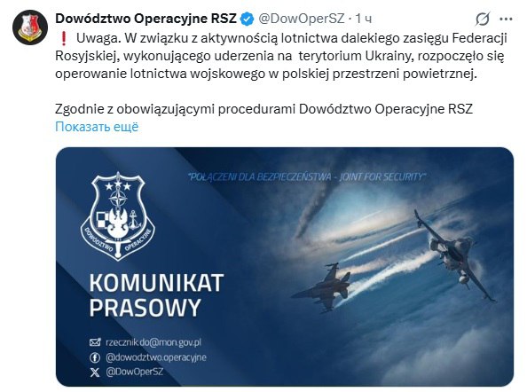 «В связи с активностью дальней авиации Российской Федерации, наносящей удары по территории Украины, началось действие военной авиации в воздушном пространстве Польши. В соответствии с действующими процедурами Оперативное командование Вооруженных сил Польши привело в действие необходимые силы и средства, находящиеся в его распоряжении. Наземные системы противовоздушной обороны и радиолокационного обнаружения приведены в состояние готовности»,