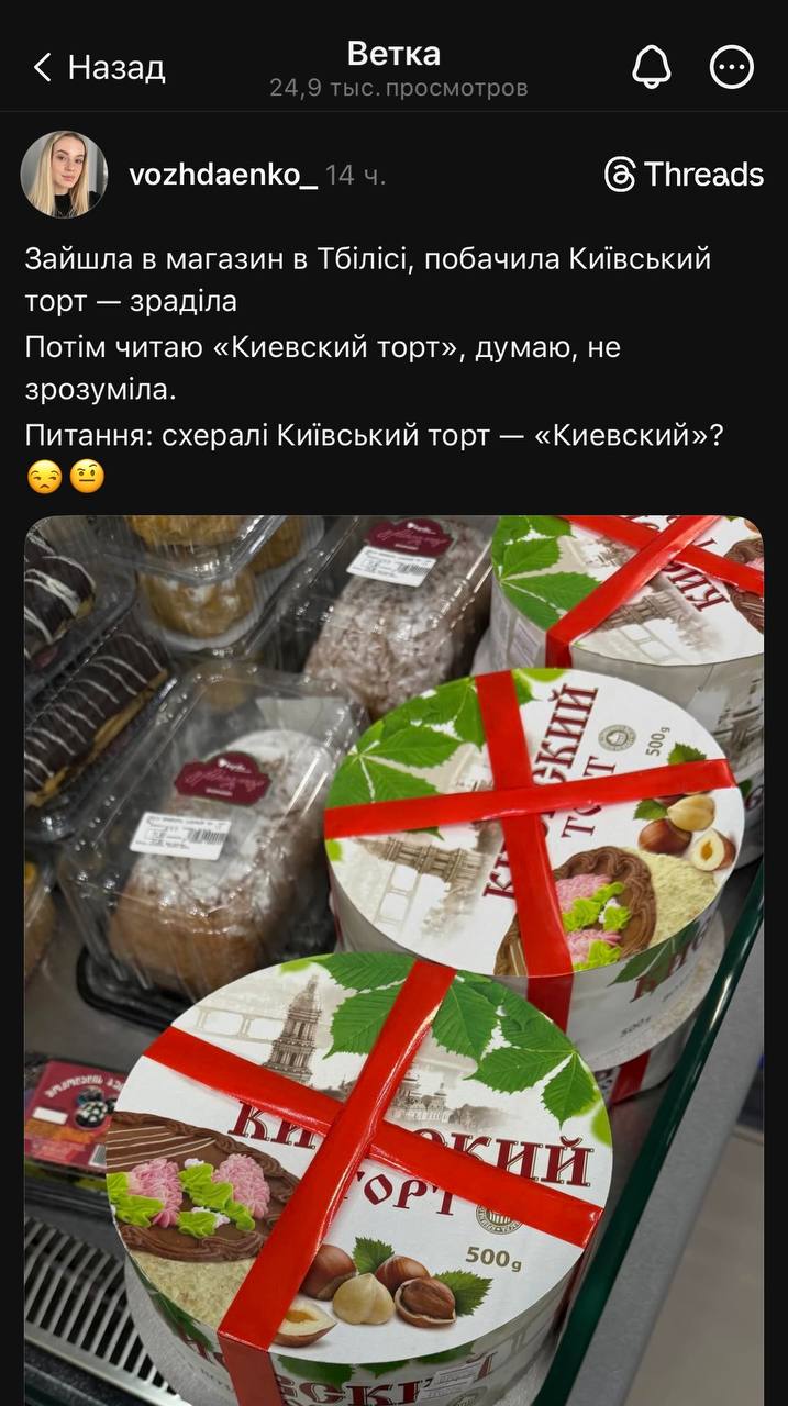 В этот раз источником зрадогенотьбы стал торт "Киевский", и все бы ничего, да только надпись оказалась на русском языке.