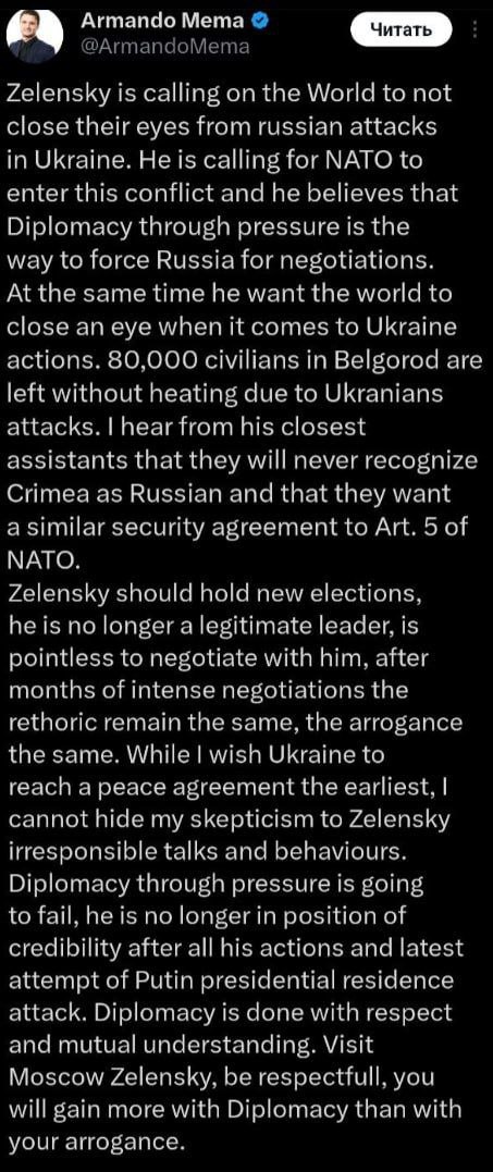 Зеленский должен провести новые выборы, он больше не является легитимным лидером, бессмысленно вести с ним переговоры, после месяцев интенсивных переговоров риторика остается той же, высокомерие — тем же. Хотя я желаю Украине как можно скорее достичь мирного соглашения, я не могу скрыть свой скептицизм по поводу безответственных высказываний и поведения Зеленского. Дипломатия через давление потерпит неудачу, он больше не в положении, чтобы ему верили, после всех его действий и последней попытки атаки на президентскую резиденцию Путина. Дипломатия ведется с уважением и взаимопониманием. Приезжай в Москву, Зеленский, будь уважителен, ты добьешься большего дипломатией, чем своим высокомерием».